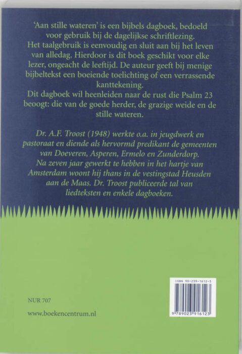 Van dit dagboek zijn er inmiddels meer dan 100.000 verkocht en nog steeds is er grote vraag naar. Niet verwonderlijk. Ds. A.F. Troost weet zo te schrijven dat zijn dagelijkse meditaties een heel breed publiek aanspreken. Hiermee is Aan stille wateren een dagboek voor elke lezer, ongeacht leeftijd.