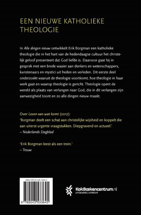 In Alle dingen nieuw presenteert Erik Borgman een katholieke theologie die in het hart van de hedendaagse cultuur al denkend het christelijk geloof presenteert dat God liefde is. Daarvoor gaat Erik Borgman in Alle dingen nieuw in gesprek met een brede waaier aan denkers en wetenschappers, kunstenaars en mystici uit heden en verleden. Dit eerste deel onderzoekt waar de theologie begint en wat theologie op het oog heeft. Theologie opent de wereld als plaats van verlangen naar God, die in dit verlangen zijn aanwezigheid toont. Alle dingen nieuw werd verkozen tot het Beste Theologische Boek van het jaar 2019/2020.