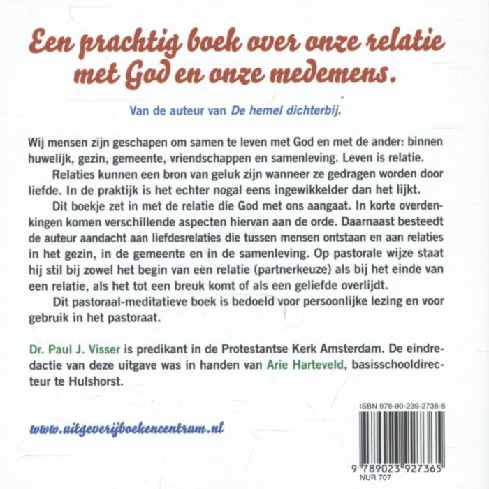 Wij mensen zijn geschapen om samen te leven met God en met de ander: binnen huwelijk, gezin, gemeente, vriendschappen en samenleving. Leven is relatie. Relaties kunnen een bron van geluk zijn wanneer ze gedragen worden door liefde. In de praktijk is het echter nogal eens ingewikkelder dan het lijkt. Dit boekje zet in met de relatie die God met ons aangaat. In korte overdenkingen komen verschillende aspecten hiervan aan de orde. Daarnaast besteedt de auteur aandacht aan liefdesrelaties die tussen mensen ontstaan en aan relaties in het gezin, in de gemeente en in de samenleving. Op pastorale wijze staat hij stil bij zowel het begin van een relatie (partnerkeuze) als bij het einde van een relatie, als het tot een breuk komt of als een geliefde overlijdt. Dit pastoraal-meditatieve boek is bedoeld voor persoonlijke lezing en voor gebruik in het pastoraat.