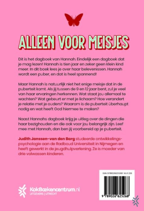 Als jij tussen de 9 en 12 bent, kun je van dit boek veel leren. Wat staat er allemaal op je te wachten als je ouder wordt? Wat gebeurt er als tiener met je lichaam? Hoe verandert je leven en je relatie met je ouders? Waarom is de puberteit überhaupt nodig en wat heeft God hiermee te maken? ‘Alleen voor meisjes’ is het dagboek van Hannah. Eindelijk een dagboek dat je mag lezen! Hierin lees je alles over haar belevenissen, want er gebeurt van alles in de puberteit. Hannah is bezig puber te worden en dat is heel spannend.