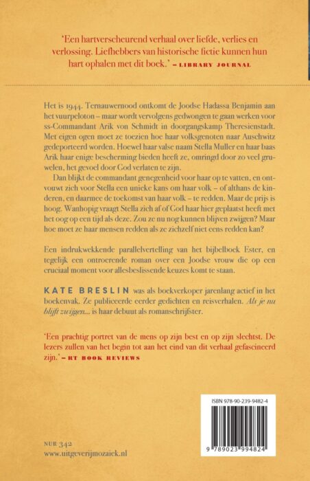 Het is 1944. Ternauwernood ontkomt de Joodse Hadassa Benjamin aan het vuurpeloton – maar wordt vervolgens gedwongen te gaan werken voor SS-Commandant Arik von Schmidt in doorgangskamp Theresienstadt. Met eigen ogen moet ze toezien hoe haar volksgenoten naar Auschwitz gedeporteerd worden. Hoewel haar valse naam Stella Muller en haar baas Arik haar enige bescherming bieden heeft ze, omringd door zo veel gruwelen, het gevoel door God verlaten te zijn. Dan blijkt de commandant genegenheid voor haar op te vatten, en ontvouwt zich voor Stella een unieke kans om haar volk – of althans de kinderen, en daarmee de toekomst van haar volk – te redden. Maar de prijs is hoog. Wanhopig vraagt Stella zich af of God haar hier geplaatst heeft met het oog op een tijd als deze. Zou ze nu nog kunnen blijven zwijgen? Maar hoe moet ze haar mensen redden als ze zichzelf niet eens redden kan? Een indrukwekkende parallelvertelling van het bijbelboek Ester , en tegelijk een ontroerende roman over een Joodse vrouw die op een cruciaal moment voor allesbeslissende keuzes komt te staan Kate Breslin was als boekverkoper jarenlang actief in het boekenvak. Ze publiceerde eerder gedichten en reisverhalen. Als je nu blijft zwijgen… is haar debuut als romanschrijfster. ‘Een hartverscheurend verhaal over liefde, verlies en verlossing. Liefhebbers van historische fictie kunnen hun hart ophalen met dit boek. - Library Journal