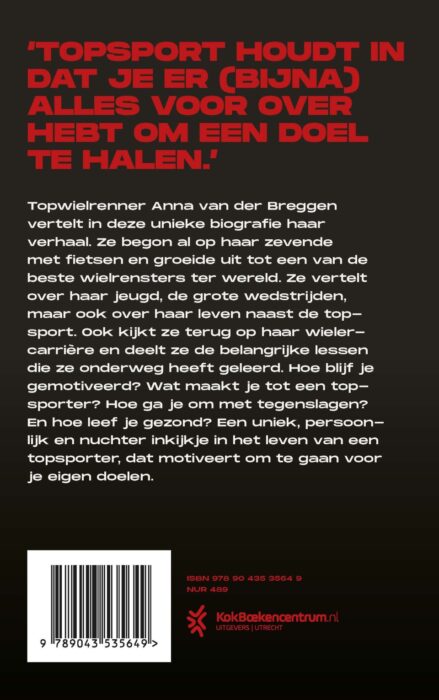 De unieke biografie ‘ANNA’ vertelt het levensverhaal van topwielrenster Anna van der Breggen, die op haar zevende al met fietsen begon en één van de beste wielrensters ter wereld werd. In dit boek blikt ze terug op haar wielercarrière en de belangrijke lessen die ze onderweg heeft geleerd, en geeft ze tips en adviezen aan de lezer. Hoe blijf je bijvoorbeeld gemotiveerd? Wat maakt je tot een topsporter? Hoe ga je om met tegenslagen? En hoe leef je gezond? Een uniek, humoristisch en nuchter inkijkje in het leven van een topsporter. De omslagfoto is gemaakt door Laura de Mildt.