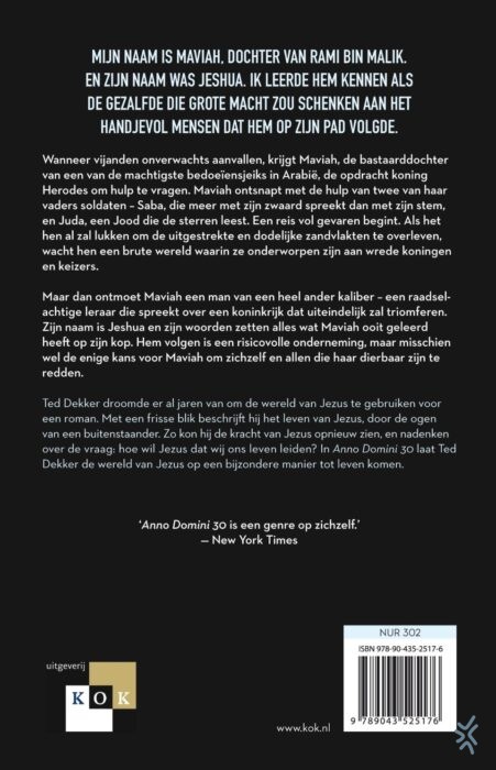 Tien jaar heeft Ted Dekker eraan gewerkt: zijn meesterwerk ‘Anno Domini 30’. Wanneer vijanden onverwachts aanvallen, krijgt Maviah, de bastaarddochter van een van de meest machtige bedoeïensjeiks in Arabië, de opdracht koning Herodes om hulp te vragen. Maviah ontsnapt met de hulp van twee van haar vaders soldaten – Saba, die meer met zijn zwaard spreekt dan met zijn stem, en Juda, een Jood die de sterren leest. Een reis vol gevaren begint, maar als het hen al zal lukken om de uitgestrekte en dodelijke zandvlakten te overleven, wacht hen een brute wereld waarin ze onderworpen zijn aan wrede koningen en keizers. Maar dan ontmoet Maviah een man van een heel ander kaliber – een raadselachtige leraar die spreekt over een koninkrijk dat uiteindelijk zal triomferen en het zal winnen van welk koninkrijk dan ook. Zijn naam is Jeshua en Zijn woorden zetten alles wat Maviah ooit geleerd heeft op zijn kop. Maar ondanks dat het volgen van Hem een risicovolle onderneming is, is het misschien wel de enige kans voor Maviah om zichzelf en allen die haar dierbaar zijn te redden. Ted Dekker, de koning van de christelijke thriller, is bekend van onder andere De Cirkel-serie: ‘Zwart’, ‘Rood’, ‘Wit’ en ‘Groen’. In deze eerste Bijbels-historische roman van zijn hand betreed je als lezer samen met Maviah de wereld waarin Jezus leefde en beleef je met haar mee hoe revolutionair Jezus’ woorden zijn geweest: een draai van 180 graden.