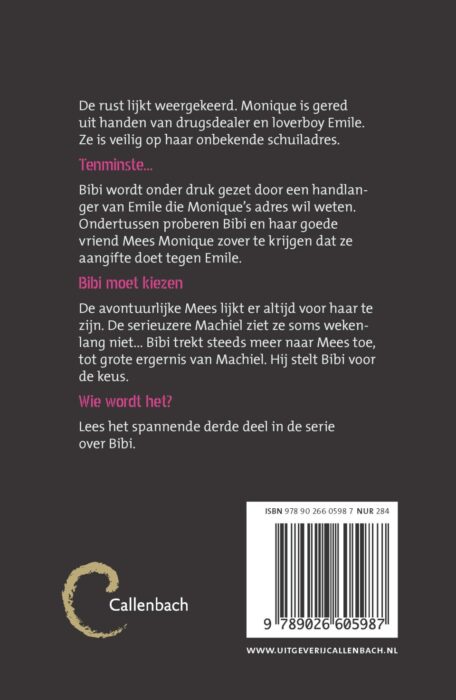 De rust lijkt weergekeerd. Monique is gered uit handen van drugsdealer en loverboy Emile. Ze is veilig op haar onbekende schuiladres. Tenminste… Bibi wordt onder druk gezet door een handlanger van Emile die Monique’s adres wil weten. Ondertussen proberen Bibi en haar goede vriend Mees Monique zover te krijgen dat ze aangifte doet tegen Emile. Bibi moet kiezen De avontuurlijke Mees lijkt er altijd voor haar te zijn. De serieuzere Machiel ziet ze soms wekenlang niet… Bibi trekt steeds meer naar Mees toe, tot grote ergernis van Machiel. Hij stelt Bibi voor de keus. Wie wordt het? Lees het spannende derde deel in de serie over Bibi.