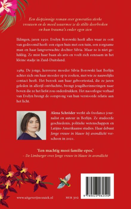 Ildingen, jaren 1950. In ‘Bij jullie is het altijd zo ontzettend stil’ van Alena Schröder heeft Evelyn Borowski alles waar ze ooit van gedroomd heeft: een eigen huis met een tuin, een zorgzame man en haar langverwachte dochter Silvia. Maar ze is niet gelukkig. Ze mist haar baan als arts en voelt zich eenzaam in het kleine stadje in Zuid-Duitsland. 1989. De jonge, kersverse moeder Silvia Borowski laat Berlijn achter zich om haar moeder op te zoeken, met wie ze nauwelijks contact heeft. Het bezoek aan haar geboortestad, die ze jaren geleden in allerijl ontvluchtte, brengt jeugdherinneringen naar boven die ze het liefst zou onderdrukken. Het naoorlogse verhaal van Evelyn brengt de oorsprong van hun verstoorde relatie aan het licht.