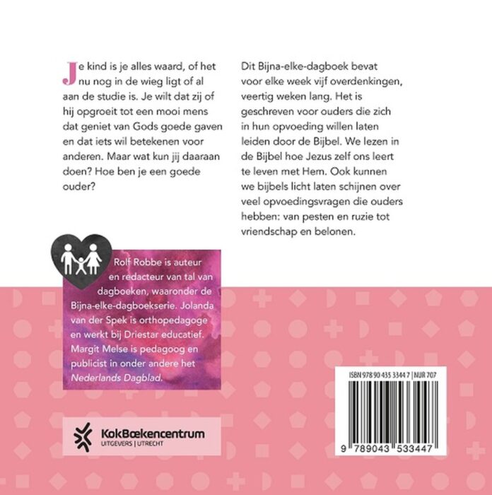 ‘Bijna-elke-dagboek voor moeders en vaders’ van Rolf Robbe, Jolanda Spek en Margit Melse is een dagboek voor ouders die zich in hun opvoeding willen laten leiden door de Bijbel. Het bevat voor elke week vijf overdenkingen, veertig weken lang. Je kind is je alles waard, of het nu nog in de wieg ligt of al aan de studie is. Je wilt dat zij of hij opgroeit tot een mooi mens dat geniet van Gods goede gaven en dat iets wil betekenen voor anderen. Maar wat kun jij daaraan doen? Hoe ben je een goede ouder? We lezen in de Bijbel hoe Jezus zelf ons leert leven met Hem. Ook kunnen we Bijbels licht laten schijnen over al die opvoedingskwesties die we tegenkomen, van pesten en ruzie tot vriendschap en belonen.