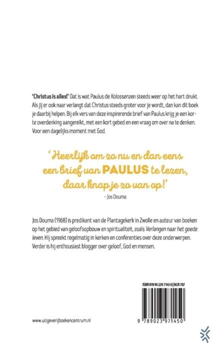 'Christus is alles!' Dat is wat Paulus de Kolossenzen steeds weer op het hart drukt. Als jij er ook naar verlangt dat Christus steeds groter voor je wordt, dan kan dit boek je daarbij helpen. Bij elk vers van deze inspirerende brief van Paulus krijg je een korte overdenking aangereikt, met een kort gebed en een vraag om over na te denken. Voor een dagelijks moment met God. Jos Douma: 'Heerlijk om zo nu en dan eens een brief van Paulus te lezen, daar knap je zo van op!'