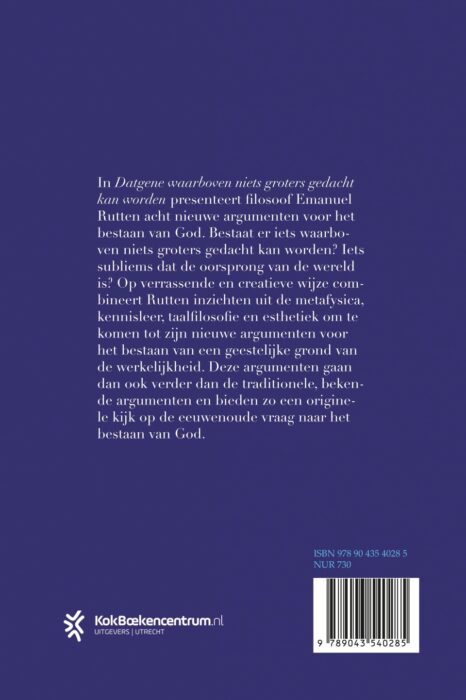 In Datgene waarboven niets groters gedacht kan worden presenteert filosoof Emanuel Rutten acht nieuwe argumenten voor het bestaan van God. Bestaat er iets waarboven niets groters gedacht kan worden? Iets subliems dat de oorsprong van de wereld is? Op verrassende en creatieve wijze combineert Rutten inzichten uit de metafysica, kennisleer, taalfilosofie en esthetiek om te komen tot zijn nieuwe argumenten voor het bestaan van een geestelijke grond van de werkelijkheid. Deze argumenten gaan dan ook verder dan de traditionele, bekende argumenten en bieden zo een originele kijk op de eeuwenoude vraag naar het bestaan van God.