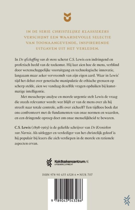In ‘De afschaffing van de mens’ schetst C.S. Lewis de toekomst van de mens, die door ontwikkelingen in wetenschap en techniek vervreemd raakt van zijn menselijke identiteit. In Lewis’ tijd speelde het ethische dilemma van genetische manipulatie. In deze tijd kun je denken aan de toepassing van kunstmatige intelligentie. Dit profetische boek laat zien waar de mens ophoudt mens te zijn en doet een dringend appel op het fundament van onze normen en waarden.