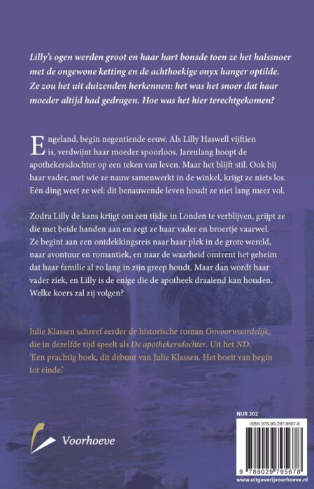 Engeland, begin negentiende eeuw. Als Lilly Haswell vijftien is, verdwijnt haar moeder spoorloos. Jarenlang hoopt de apothekersdochter op een teken van leven. Maar het blijft stil. Ook van haar vader, met wie ze nauw samenwerkt, krijgt ze niets los over dit familiegeheim.