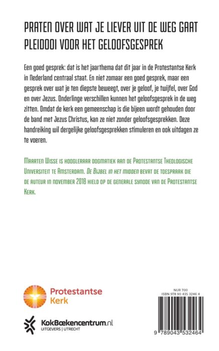 ‘De Bijbel in het midden’ van Maarten Wisse is een pleidooi voor het geloofsgesprek in de kerk te midden van verschillen. Een goed gesprek: dat is het jaarthema dat in 2019 in de Protestantse Kerk in Nederland centraal staat. En niet zomaar een goed gesprek, maar een gesprek over wat je ten diepste beweegt, over je geloof, je twijfel, over God en over Jezus. Onderlinge verschillen kunnen het geloofsgesprek in de weg zitten. Omdat de kerk een gemeenschap is die bijeen wordt gehouden door de band met Jezus Christus, kan ze niet zonder geloofsgesprekken. Deze handreiking wil dergelijke geloofsgesprekken stimuleren en ook uitdagen ze te voeren.