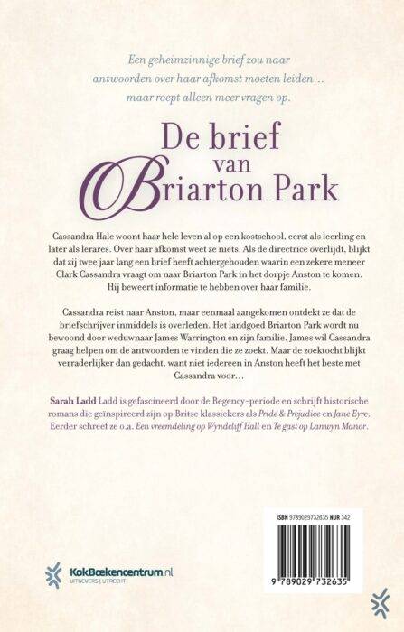 De brief van Briarton Park van Sarah Ladd is een spannende Regency-roman waarin de jonge Cassandra een geheimzinnige brief ontvangt die haar hele leven op zijn kop zet. Ze heeft altijd als wees in een kostschool gewoond en weet niet veel van haar ouders. Als de directrice van de kostschool overlijdt, krijgt Cassandra de brief in handen, waarin haar gevraagd wordt naar Briarton Park te komen. Cassandra bedenkt zich geen moment en reist ernaartoe, maar als ze aangekomen is, treft ze een weduwnaar met twee dochters, zijn zus en zijn schoonmoeder in plaats van de briefschrijver. Samen met de weduwnaar raakt ze verstrikt in het oplossen van een moordzaak, waarop hij probeert haar te helpen met het vinden van de antwoorden op de vragen waarmee ze naar Briarton Park is gekomen. De zoektocht naar antwoorden levert meer op dan Cassandra ooit had durven dromen.