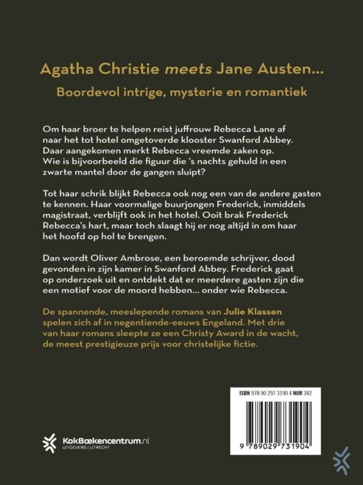 De echo van Swanford Abbey van Julie Klassen is een Regency-roman boordevol mysterie, intrige en romantiek. Wanneer Rebecca Lane afreist naar het tot hotel omgetoverde Swanford Abbey, kan ze niet vermoeden dat ze daar Sir Frederick tegen zal komen, de man die ooit haar hart brak. En ze had al helemaal niet kunnen raden dat Swanford Abbey het decor zou worden van de moord op een beroemde schrijver. Sir Frederick gaat op onderzoek uit en ontdekt dat er meerdere gasten zijn die een motief voor de moord hebben, onder wie Miss Lane…