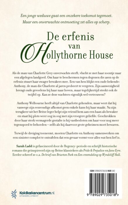 ‘De erfenis van Hollythorne House’ van Sarah Ladd is een meeslepende historische roman over een weduwe met een onzekere toekomst die een tweede kans krijgt in de liefde. Als Charlottes man onverwachts sterft, vlucht ze met haar jonge zoontje naar een afgelegen landgoed om hem te beschermen tegen haar schoonfamilie, die aast op haar erfenis. Haar voormalige zwager laat hen niet zomaar gaan en stuurt bewakers achter Charlotte aan om haar in de gaten te houden. Dan blijkt een van de bewakers een oude bekende te zijn: Anthony Welbourne, de man die Charlotte al jaren probeert te vergeten. Ze staat voor een moeilijke keuze: Anthony vertrouwen of alles wat haar dierbaar is op het spel zetten.