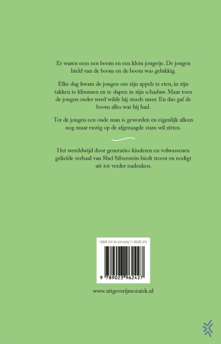 Er waren eens een boom en een klein jongetje. De jongen hield van de boom en de boom was gelukkig. Naarmate het jongetje ouder wordt heeft hij steeds iets van de boom nodig en de boom blijft onvoorwaardelijk alles geven. Tot de jongen een oude man is geworden en eigenlijk alleen nog maar rustig op de afgezaagde stam wil zitten.
