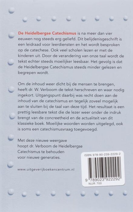 De Heidelbergse Catechismus Een eigentijdse weergave door dr. W. Verboom De Heidelbergse Catechismus is na meer dan vier eeuwen nog steeds een geliefd boek in veel kerken. Daar fungeert het als leidraad voor leerdiensten en wordt het besproken op de catechese. Ook op veel scholen wordt met de kinderen gelezen in dit oude boek. Door de verandering van onze taal wordt de tekst echter steeds moeilijker leesbaar. Het gevolg is dat de Heidelbergse Catechismus steeds minder gelezen en begrepen wordt.