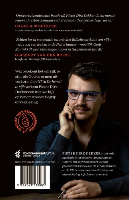 In De hemel te rijk verkent Pieter Dirk Dekker een nieuwe kijk op het omstreden begrip uitverkiezing. Dure auto’s, succesvolle outfits, gelikte livestreams – wie een kerk bezoekt, merkt lang niet altijd dat God vooral oog voor de armen heeft. Toch is dat wat de Bijbel betreft een cruciaal aspect van het evangelie. Sterker nog: sommige Bijbelteksten stellen dat God de armen uitverkoren heeft. Tegenover een almaar populairder welvaartsevangelie zet Pieter Dirk Dekker de vraag: wat betekent het om rijk te zijn, als God de armen uitverkoren heeft?