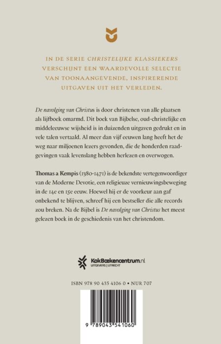 Het boek 'De navolging van Christus' van de middeleeuwse monnik Thomas a Kempis is door christenen van alle plaatsen als lijfboek omarmd. Dit boek van bijbelse, oud-christelijke en middeleeuwse wijsheid is in duizenden uitgaven gedrukt en in allerlei talen vertaald. Al meer dan vijf eeuwen lang heeft het de weg naar miljoenen lezers gevonden, die de vele honderden raadgevingen vaak levenslang hebben herlezen en overwogen.