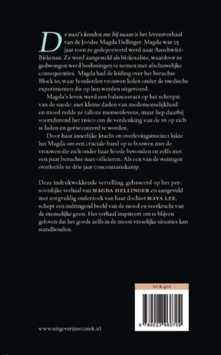 'De nazi’s kenden me bij naam' is het levensverhaal van Magda Hellinger, die als blokoudste werd aangesteld in Auschwitz-Birkenau en onmogelijke keuzes moest maken. Ze had de leiding over het beruchte Block 10, waar honderden vrouwen leden onder de medische experimenten die op hen werden uitgevoerd. Magda’s leven werd hiermee een balanceeract op het scherpst van de snede: met kleine daden van medemenselijkheid en moed redde ze talloze mensenlevens, maar liep daarbij voortdurend het risico om de verdenking van de SS op zich te laden en geëxecuteerd te worden. Door haar innerlijke kracht en instinct om te overleven lukte het haar om vriendschappen op te bouwen met de vrouwen die zich onder haar hoede bevonden en zelfs respect te krijgen van de nazi-officieren.