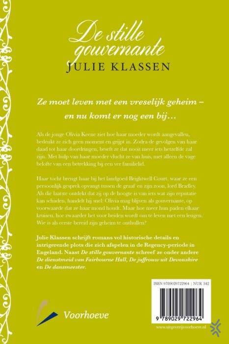 Als de jonge Olivia Keene ziet hoe haar vader haar moeder wurgt, bedenkt ze zich geen moment en grijpt het eerste het beste voorwerp om hem voor het hoofd te slaan. Zodra de gevolgen van haar daad tot haar doordringen, beseft ze dat niets ooit meer hetzelfde zal zijn. Haar moeder helpt haar te vluchten en regelt een onder-komen bij een oude kennis aan het hof van Brightwell. Daar vangt Olivia, die door het trauma niet meer kan spreken, een geheim gesprek op tussen de heer des huizes en zijn zoon Edward. Edward ontdekt dat Olivia op de hoogte is van informatie die zijn reputatie kan schaden en stelt haar aan als gouvernante om haar in de gaten te kunnen houden. Maar hoe vaker hun paden elkaar kruisen, hoe duidelijker wordt dat zij niet zijn grootste bedreiging, maar juist zijn redding blijkt te zijn. Na Onvoorwaardelijk en De apothekersdochter schreef Julie Klassen opnieuw een prachtige historische thriller die speelt in de Regency-periode in Engeland. Liefhebbers van Jane Austen kunnen hun hart ophalen aan De stille gouvernante!