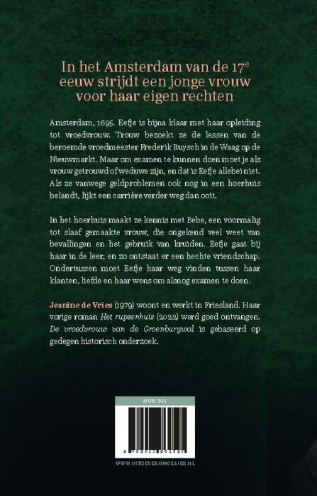 Amsterdam, 1695. In ‘De vroedvrouw van de Groenburgwal’ van Jeanine de Vries wil Eefje vroedvrouw worden. Ze zou haar examen halen bij de beroemde geleerde Frederik Ruysch, maar haar moeder stuurt haar naar een hoerhuis om geld te verdienen. Daar maakt ze kennis met de zwarte Bebé, een voormalig tot slaaf gemaakte vrouw, die ongekend veel weet van bevallingen. Eefje gaat bij haar in de leer. Zo leert ze hoe ze met kruiden haar eigen zwangerschap kan afbreken, al is de vader van het kind een van de weinige klanten die goed voor haar is. Ze wordt de vaste ‘haalhoer’ voor deze vriendelijke Johannes, waardoor ze haar schulden kan afbetalen en zich verder kan ontwikkelen tot een goede vroedvrouw. In deze woelige tijden waarin Eefje ontdekt dat ze zelf een onecht kind is, en haar kansen op een goed leven verkeken lijken, is Bebé de enige op wie ze nog kan vertrouwen.