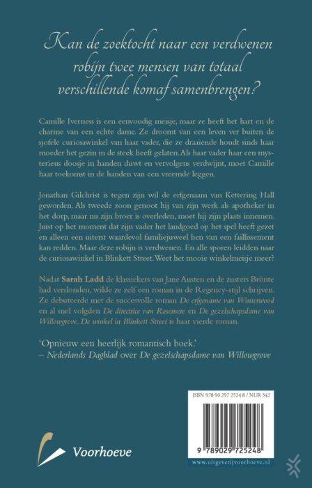 ‘De winkel in Blinkett Street’ van Sarah Ladd: in het Engeland van het begin van de negentiende eeuw, zetten twee jonge mensen zich af tegen hun afkomst. Camille Iverness is een eenvoudig winkelmeisje, maar ze heeft het hart en de charme van een echte dame. Sinds haar moeder hun in de steek heeft gelaten, zorgt ze voor haar familie en houdt ze hun sjofele curiositeitenwinkel draaiende. Maar een verraderlijke daad gooit roet in het eten en dwingt Camille haar toekomst in de handen van een vreemde te leggen. Jonathan Gilchrist is tegen zijn wil in de erfgenaam van Kettering Hall geworden. Als tweede zoon genoot hij van zijn werk als apotheker in het dorp, maar nu zijn broer is overleden, moet hij zijn plaats innemen. Juist op het moment dat zijn vader het landgoed op het spel heeft gezet en alleen een uiterst waardevol familiejuweel hen van een faillissement kan redden. Maar deze robijn is verdwenen. En alle sporen leidden naar de Iverness curiositeitenwinkel in Blinkett Street. Weet het mooie winkelmeisje meer Sarah Ladd schrijft net als Julie Klassen historische romans die zich afspelen in de Regency-periode in Engeland