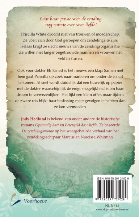 Jody Hedlund liet zich bij het schrijven van 'De zendelingsvrouw' inspireren door het waargebeurde verhaal over het zendelingsechtpaar Marcus en Narcissa Whitman. Eerder verscheen van haar hand de roman 'De predikersbruid'.
