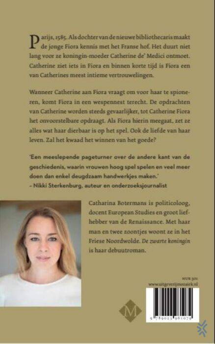 'De zwarte koningin' van Catharina Botermans speelt zich af in Parijs, 1580. Als dochter van de nieuwe bibliothecaris maakt de jonge Fiora haar debuut aan het Franse hof. Het duurt niet lang voor ze koningin-moeder Catherine de' Medici ontmoet. Catherine ziet iets in Fiora en binnen korte tijd is Fiora een van Catherines meest intieme vertrouwelingen.