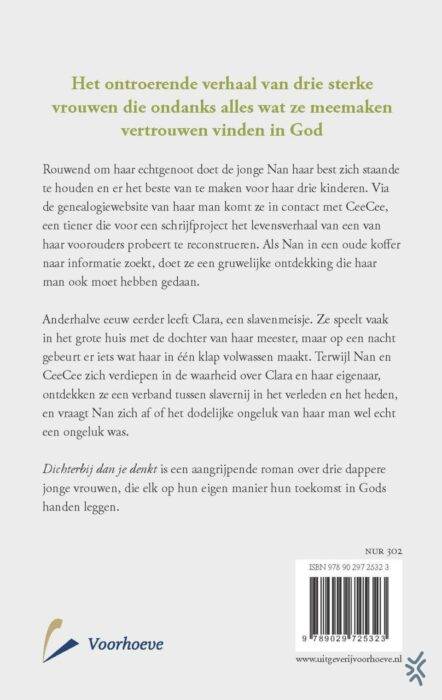 Dichterbij dan je denkt’ van Elizabeth Musser is het ontroerende verhaal van drie sterke vrouwen die ondanks alles wat ze meemaken vertrouwen in God vinden. Rouwend om haar echtgenoot, doet de jonge Nan haar best staande te blijven en het beste van haar leven te maken voor haar drie kinderen. Via de genealogiewebsite van haar man komt ze in contact met CeeCee, een tiener die voor een schrijfproject het levensverhaal van een van haar voorouders probeert te reconstrueren. Als Nan in een oude koffer naar informatie zoekt, doet ze de gruwelijke ontdekking die haar man ook moet hebben gedaan. Anderhalve eeuw eerder leeft Clara, een slavenmeisje. Ze speelt vaak in het grote huis met de dochter van haar eigenaar, maar op een nacht gebeurt er iets wat haar in één klap volwassen maakt.Terwijl Nan en CeeCee zich verdiepen in de waarheid over Clara en haar eigenaar, ontdekken ze een verband tussen slavernij in het verleden en het heden, en vraagt Nan zich af of het dodelijke ongeluk van haar man wel echt een ongeluk was. Bemoediging speelt dan ook een grote rol in de romans van Elizabeth Musser. Eerder verschenen van haar hand onder andere de romans ‘Het huis op de heuvel’, ‘Schuilplaats’ en ‘Aan de andere kant van de bergen’.