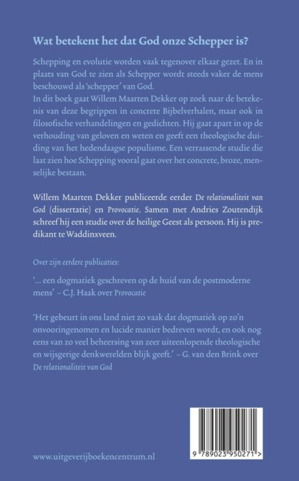Maar wat bedoelen we dan met 'schepping' en 'Schepper'? Willem Maarten Dekker gaat op zoek naar de betekenis van die begrippen in concrete bijbelverhalen. Daarnaast gaat hij dieper in op de vraag wat het geloof in God de Schepper betekent. Schepping gaat vooral ook over het concrete, broze menselijke bestaan: over baren en sterven, hopen en wanhopen.