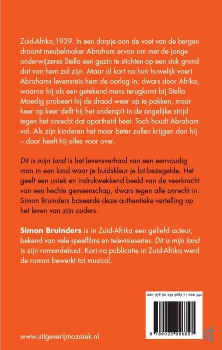 Simon Bruinders is in Zuid-Afrika een geliefd acteur, bekend van vele speelfilms en televisieseries. Dit is mijn land is zijn romandebuut. Kort na publicatie in Zuid-Afrika werd de roman bewerkt tot musical.