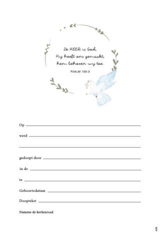 Deze doopkaart (nr. 405) is een mooie herinnering aan de doop. Formaat A5, invulmogelijkheden voor naam, datum, dooptekst enz. Bijbeltekst is in NBV. Wordt geleverd in sets van 10 kaarten.