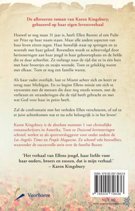 ‘Duizend herinneringen’ is de allereerste roman van Karen Kingbury en is gebaseerd op haar eigen levensverhaal. Hoewel ze nog maar 31 jaar is, heeft Ellen Barrett al een Pulitzer Prize op haar naam staan. Maar alle andere aspecten van haar leven zitten tegen. Ze worstelt met haar huwelijk en geloof, en wordt achtervolgd door herinneringen aan haar jeugd in haar pittoreske geboorteplaats en de liefde die ze daar achterliet. Ze verlangt naar de tijd dat ze in één huis met haar broertjes en zusjes woonde. Toen ze gelukkig waren met elkaar. Toen ze nog een familie waren. Als haar vader overlijdt, laat ze Miami voor wat het is en keert ze terug naar Michigan. En zo begint Ellens missie om zich te verzoenen met de mensen die daar nog steeds leven, met de verliezen en veranderingen die de tijd heeft gebracht en met wat God voor haar in petto heeft. ‘Het verhaal van Ellens jeugd, haar liefde voor haar ouders, broers en zussen, dat is mijn verhaal’ – Karen Kingsbury