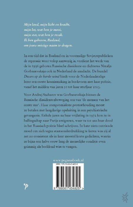 In een tijd dat in Rusland en in voormalige Sovjetrepublieken de repressie weer volop aanwezig is, verdient het werk van de in 1936 geboren Russische dissidente en dichteres Natalja Gorbanevskaja ook in Nederland de aandacht. De bundel Dwars op de harde wind biedt voor de Nederlandstalige lezer een eerste kennismaking in boekvorm met haar poëzie, vanaf het midden van jaren 50 tot haar sterfjaar 2013.