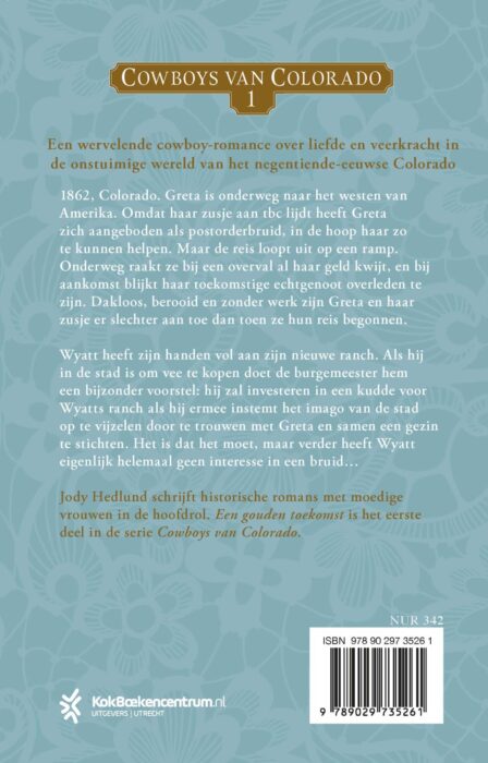 ‘Een gouden toekomst’ van Jody Hedlund speelt zich af in 1862, Colorado. Greta’s reis naar het westen van Amerika om haar zusje te helpen loopt uit op een ramp: onderweg raakt ze al haar geld kwijt bij een overval én bij aankomst blijkt haar toekomstige echtgenoot overleden te zijn. Dakloos, berooid en zonder werk zijn Greta en haar zusje er slechter aan toe dan toen ze hun reis begonnen.