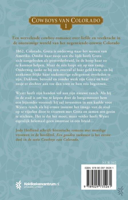 ‘Een gouden toekomst’ van Jody Hedlund speelt zich af in 1862, Colorado. Greta’s reis naar het westen van Amerika om haar zusje te helpen loopt uit op een ramp: onderweg raakt ze al haar geld kwijt bij een overval én bij aankomst blijkt haar toekomstige echtgenoot overleden te zijn. Dakloos, berooid en zonder werk zijn Greta en haar zusje er slechter aan toe dan toen ze hun reis begonnen.