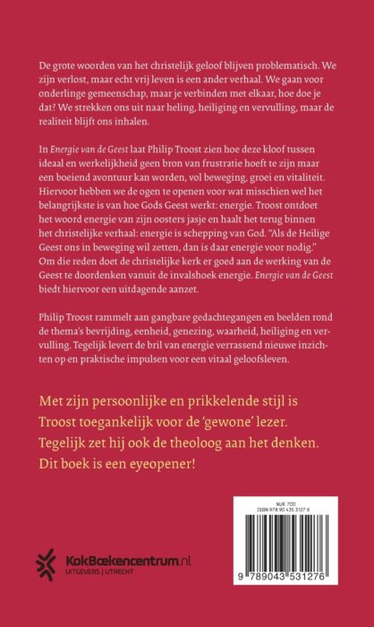 In ‘Energie van de Geest’ herijkt Philip Troost de kernwoorden van het christelijk geloof. We zijn verlost, maar echt vrij leven is een ander verhaal. We gaan voor onderlinge gemeenschap, maar je verbinden met elkaar, hoe doe je dat? Philip Troost laat zien hoe deze kloof tussen ideaal en werkelijkheid geen bron van frustratie hoeft te zijn maar een boeiend avontuur kan worden, vol beweging, groei en vitaliteit. Hiervoor hebben we de ogen te openen voor wat misschien wel het belangrijkste is van hoe Gods Geest werkt: energie. Troost ontdoet het woord energie van zijn oosters jasje en haalt het terug binnen het christelijke verhaal: energie is schepping van God. ‘Als de Heilige Geest ons in beweging wil zetten, dan is daar energie voor nodig.’
