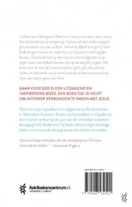 Gaan voor God van René van Loon is een uitdagend en inspirerend boek dat helpt om intenser verbonden te raken met Jezus. René van Loon spoort christenen aan zo te leven dat ze iets uitstralen naar hun omgeving. Hij laat ook zien welke stappen je kunt zetten om dat te doen. Vanuit de Bijbel brengt hij Gods bedoelingen in kaart en zoekt hij naar Gods wil in belangrijke keuzes. Daarnaast laat hij zien hoe de omstandigheden in je eigen leven van invloed kunnen zijn op de weg die je gaat. Het boek sluit af met vijf levensterreinen (geld, tijd, seksualiteit, milieu en het einde van je leven) waarop je heel concreet kunt laten zien dat je gaat voor God.