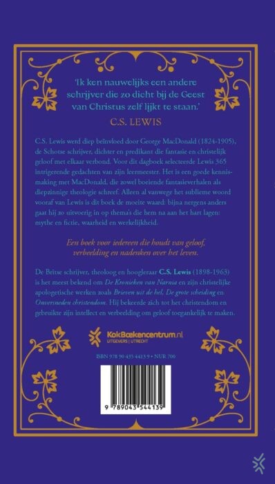 'George MacDonald' van C.S. Lewis is een dagboek met voor elke dag een inspirerende kennismaking met het werk van Lewis’ Schotse leermeester. C.S. Lewis werd immers diep beïnvloed door George MacDonald (1824-1905), de Schotse schrijver, dichter en predikant die fantasie en christelijk geloof meesterlijk verbond. In dit dagboek kiest Lewis voor elke dag een intrigerende gedachte van zijn leermeester. Het is een ideale kennismaking met MacDonald, die zowel prachtige fantasieverhalen als diepzinnige theologie schreef. Lees het rustig, dag voor dag, en ontdek hoe zijn wijsheid Lewis inspireerde en jou kan inspireren. Een boek voor iedereen die houdt van geloof, fantasie en nadenken over het leven.