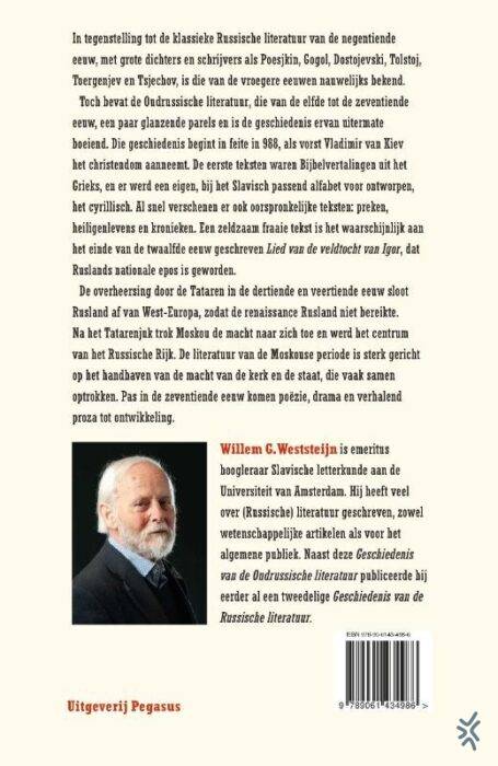 In tegenstelling tot de klassieke Russische literatuur van de negentiende eeuw, met grote dichters en schrijvers als Poesjkin, Gogol, Dostojevski, Tolstoj, Toergenjev en Tsjechov, is die van de vroegere eeuwen nauwelijks bekend. Toch bevat de Oudrussische literatuur, die van de elfde tot de zeventiende eeuw, een paar glanzende parels en is de geschiedenis ervan uitermate boeiend. Die geschiedenis begint in feite in 988, als vorst Vladimir van Kiev het christendom aanneemt. De eerste teksten waren Bijbelvertalingen uit het Grieks, en er werd een eigen, bij het Slavisch passend alfabet voor ontworpen, het cyrillisch. Al snel verschenen er ook oorspronkelijke teksten: preken, heiligenlevens en kronieken. Een zeldzaam fraaie tekst is het waarschijnlijk aan het einde van de twaalfde eeuw geschreven 'Lied van de veldtocht van Igor', dat Ruslands nationale epos is geworden. De overheersing door de Tataren in de dertiende en veertiende eeuw sloot Rusland af van West-Europa, zodat de renaissance Rusland niet bereikte. Na het Tatarenjuk trok Moskou de macht naar zich toe en werd het centrum van het Russische Rijk. De literatuur van de Moskouse periode is sterk gericht op het handhaven van de macht van de kerk en de staat, die vaak samen optrokken. Pas in de zeventiende eeuw komen poёzie, drama en verhalend proza tot ontwikkeling. Willem G. Weststeijn is emeritus hoogleraar Slavische letterkunde aan de Universiteit van Amsterdam. Hij heeft veel over (Russische) literatuur geschreven, zowel wetenschappelijke artikelen als voor het algemene publiek. Naast deze 'Geschiedenis van de Oudrussische literatuur' publiceerde hij eerder al een tweedelige 'Geschiedenis van de Russische literatuur'.