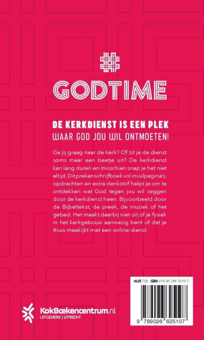 Hoe bid je? Waarom zingen we in de kerk? En hoe lees je de Bijbel? Deze vragen worden beantwoord in dit prekenschrijfboek. Veel tieners voelen zich vaak niet helemaal thuis of aangesproken in de kerk. Met ‘Godtime’ betrekt Corine Zonnenberg tieners bij de (online) kerkdienst. Met invulpagina’s, opdrachten en extra denkstof die tieners kunnen helpen in hun zoektocht naar God en de kerk.
