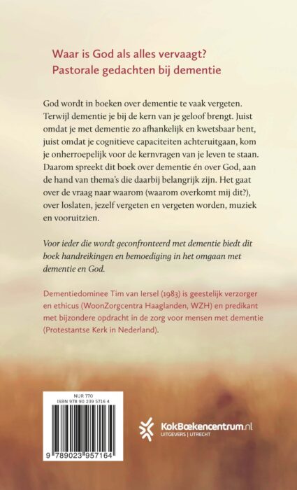 In ‘Godvergeten’ biedt Tim van Iersel handreikingen en bemoediging in het omgaan met dementie en God. Dementie brengt je bij de kern van je geloof. Juist omdat je met dementie zo afhankelijk en kwetsbaar bent, juist omdat je cognitieve capaciteiten achteruitgaan, kom je onherroepelijk voor de kernvragen van je leven te staan. Daarom spreekt dit boek over dementie én over God, aan de hand van thema’s die daarbij belangrijk zijn. Het gaat over de vraag naar waarom (waarom overkomt mij dit?), over loslaten, jezelf vergeten en vergeten worden, muziek en vooruitzien.