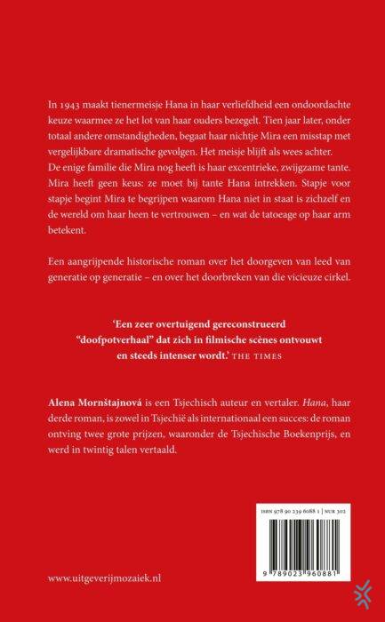 'Hana' van Alena Mornštajnová is een aangrijpende oorlogsroman over een Tsjechisch meisje en haar tante. De negenjarige Mira maakt in 1954 een grote fout waardoor ze als wees achterblijft tijdens een epidemie in Mezirící, Tsjecho-Slowakije. Haar excentrieke tante Hana is de enige familie die ze nog heeft, maar die vermijdt toenadering en zwijgt altijd. Ze kleedt zich altijd in het zwart en verlaat haar huis nooit. Mira begrijpt niets van haar, maar heeft geen andere keus dan bij haar in te trekken.