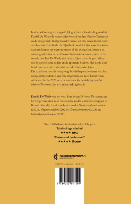 In deze vakkundige en toegankelijk geschreven handleiding ontsluit Daniël De Waele de wonderlijke wereld van het Nieuwe Testament en de vroege kerk. Heilige woorden bestaat uit drie delen. In het eerste deel bespreekt De Waele elk Bijbelboek, verduidelijkt waar de teksten vandaan komen en waarom precies al die evangeliën, brieven en andere geschriften in het Nieuwe Testament te vinden zijn. In het tweede deel laat De Waele zijn licht schijnen over de geschriften van de apostolische vaders en de apocriefe boeken. Het derde deel bevat een boeiende zoektocht naar de historische Jezus.
