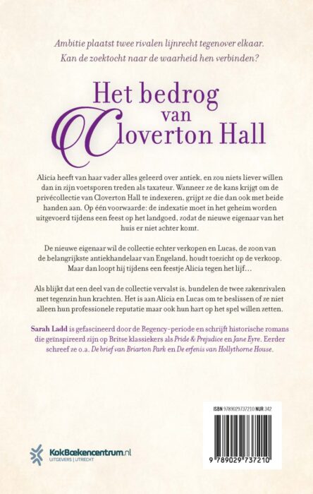 In Het bedrog van Cloverton Hall van Sarah Ladd heeft Olivia van haar vader alles geleerd over antiek. Ze zou niets liever willen dan in zijn voetsporen treden als taxateur, maar als vrouw zijn haar mogelijkheden beperkt. Als ze de kans krijgt om de privécollectie van Cloverton Hall te indexeren, grijpt ze die dan ook met beide handen aan. Intussen heeft ook verkoper Lucas zijn oog laten vallen op de verzameling. Maar dan komen ze erachter dat een deel van de collectie vervalst is én dat een van de beroemdste stukken uit de collectie beschadigd is. Lukt het de twee rivalen samen te werken en de waarheid boven tafel te krijgen?