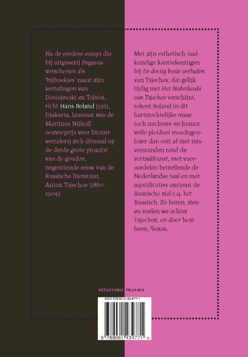Na de eerdere essays die bij uitgeverij Pegasus verschenen als ‘bijboekjes’ naast zijn vertalingen van Dostojevski en Tolstoi, richt Hans Boland (1951, Djakarta, laureaat van de Martinus Nijhoff oeuvreprijs voor literair vertalers) zich ditmaal op de derde grote prozaïst van de gouden, negentiende eeuw van de Russische literatuur, Anton Tsjechov (1860-1904). Met zijn esthetisch-taalkundige kanttekeningen bij 'De dertig beste verhalen' van Tsjechov, dat gelijktijdig met 'Het Nederlands van Tsjechov' verschijnt, rekent hij in dit hartstochtelijke maar toch nuchtere en humorvolle pleidooi meedogenlozer dan ooit af met misverstanden rond de vertaalkunst, vooroordelen betreffende de Nederlandse taal en mystificaties omtrent de Russische ziel c.q. het Russisch. Zo horen, zien en voelen we achter Tsjechov, en door hem heen, Чехов. *** Let op: deze uitgave verschijnt als 'bijboekje' bij 'De dertig beste verhalen' van Tsjechov (Athenaeum) ***