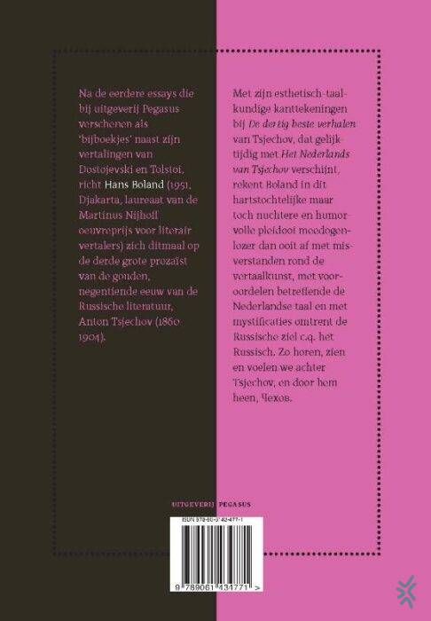 Na de eerdere essays die bij uitgeverij Pegasus verschenen als ‘bijboekjes’ naast zijn vertalingen van Dostojevski en Tolstoi, richt Hans Boland (1951, Djakarta, laureaat van de Martinus Nijhoff oeuvreprijs voor literair vertalers) zich ditmaal op de derde grote prozaïst van de gouden, negentiende eeuw van de Russische literatuur, Anton Tsjechov (1860-1904).