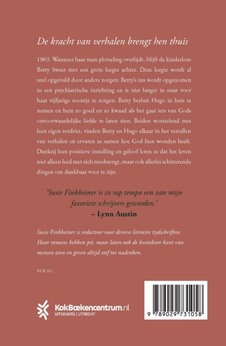 'Het verhaal dat ons verbindt' van Susie Finkbeiner is een meeslepende roman over de kracht van een positieve instelling. Omdat haar zus niet in staat is voor hem te zorgen, neemt de jonge weduwe Betty Sweet haar vijfjarige neefje Hugo in huis. Worstelend met hun verdriet, vinden Betty en Hugo elkaar in het vertellen van verhalen en ervaren ze samen hoe God hun wonden heelt. Het leven is vol zorgen, maar ook vol schitterende dingen. Het is maar net waar je naar kijkt.