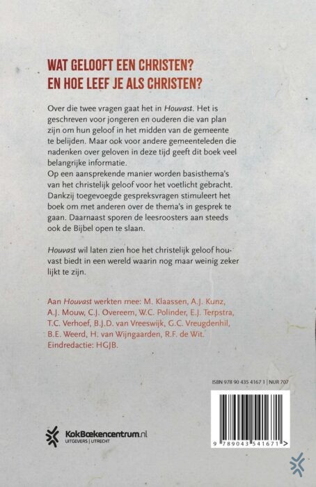 De belijdenisgids Houvast van de HGJB bevat 22 aansprekende hoofdstukken over evenveel thema’s van het christelijk geloof, zoals God leren kennen, Bijbel, verbond, gebed en discipelschap. Wat gelooft een christen? En hoe leef je als christen? Over die twee vragen gaat het in dit boek. Het is geschreven voor jongeren (en ouderen) die van plan zijn om hun geloof in Jezus Christus te belijden – in de kerk én voor hun omgeving. Het is een herziene uitgave van het veel verkochte boek Hou(d)vast (2015) en is aangevuld met een hoofdstuk over Israël. Geschreven door o.a. M. Klaassen, A.J. Kunz, A.J. Mouw, W.C. Polinder, E.J. Terpstra, T.C. Verhoef, B.J.D. van Vreeswijk, G.C. Vreugdenhil, B.E. Weerd, R.F. de Wit. Eindredactie door de HGJB.