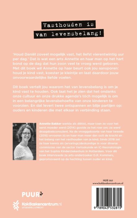 Ik houd je vast van Annette Bakker is een opvoedingsboek over fysiek ouder-kindcontact en liefdevol ouderschap. Iedereen heeft huidhonger, en zeker een kind hunkert naar de liefdevolle aanraking van zijn ouders. Al vanaf de babytijd is aanraking de krachtigste manier om met je kind te communiceren. Annette Bakker pleit in dit PUUR! balans boek voor gezonde aanraking van kinderen vanaf de geboorte. Aanraking waar ze de rest van hun leven profijt van hebben. Praktische handvatten en tips wisselt ze af met foto’s en het vroeggeboorteverhaal van haar eigen zoon Daniël.